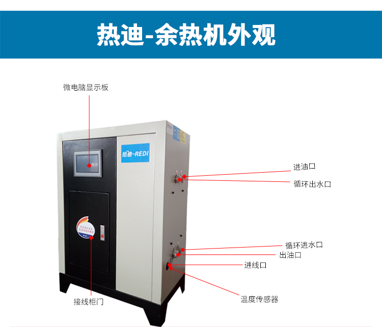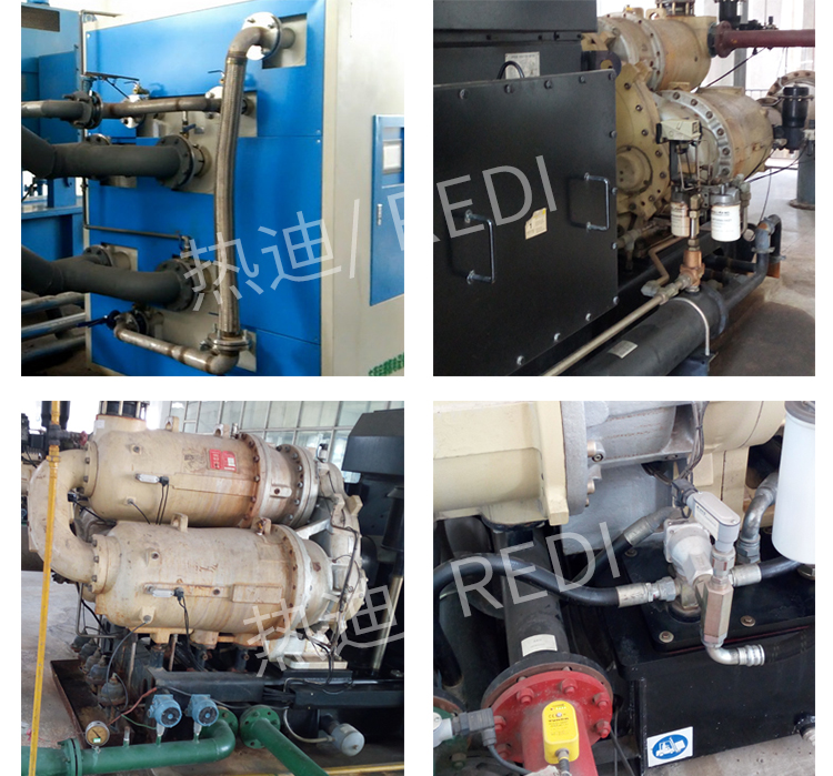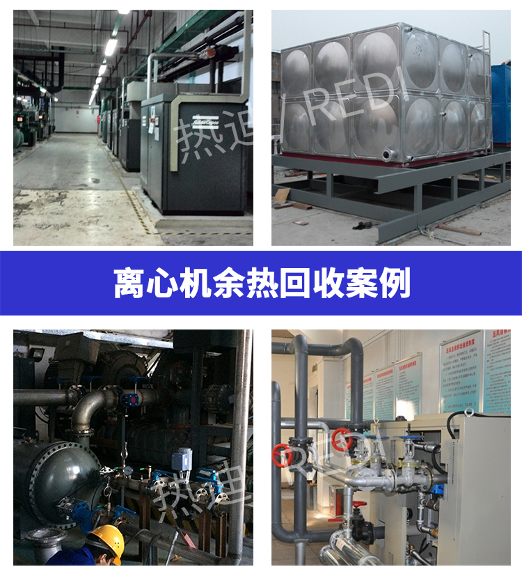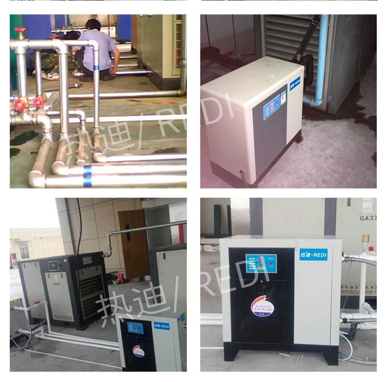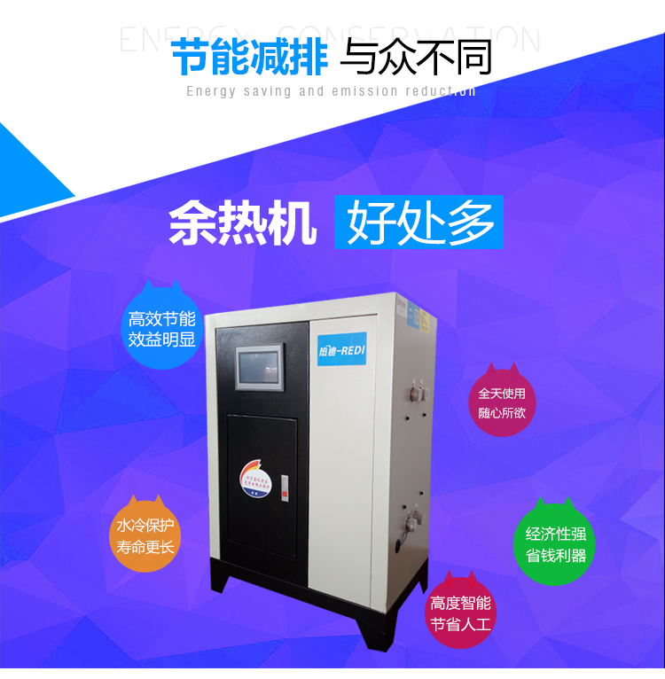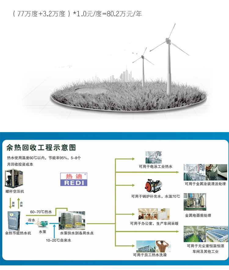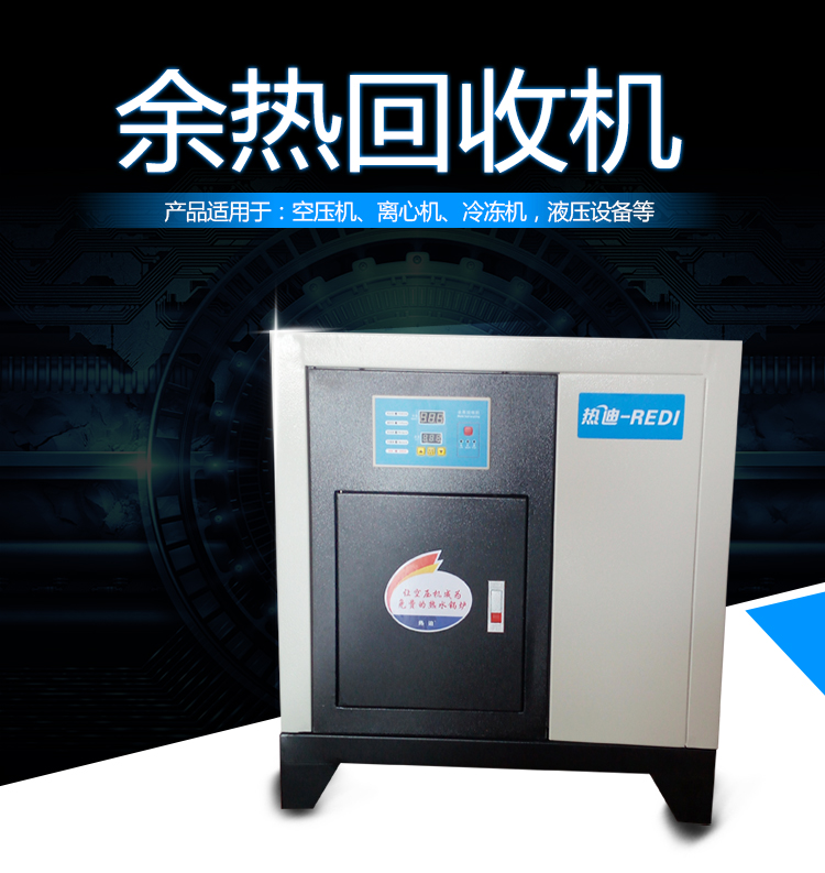螺桿式空氣壓縮機(簡稱空壓機)的工作流程如下:空氣通過進氣過濾器將大氣中的灰塵或雜質(zhì)濾除后,由進氣控制閥進入壓縮機主機,在壓縮過程中與噴入的冷卻潤滑油混合,經(jīng)壓縮后的混合氣體從壓縮腔排入油氣分離罐,從而分別得到高溫高壓的油、氣。由于機器工作溫度的要求,這些高溫高壓的油、氣必須送入各自的冷卻系統(tǒng),其中壓縮空氣經(jīng)冷卻器冷卻后,最后送入使用系統(tǒng);而高溫高壓的潤滑油經(jīng)冷卻器冷卻后,返回油路進入下一輪循環(huán);根據(jù)計算,在上述過程中,高溫高壓的油、氣所攜帶的熱量大約相當于空氣壓縮機功耗的3/4的轉(zhuǎn)化熱量,余熱溫度通常在80℃—100℃之間。螺桿式空氣壓縮機通過其自身的散熱系統(tǒng)來給高溫高壓的油、氣降溫的過程中,大量的熱能就被無端的浪費了;在提倡建設(shè)節(jié)約型社會的大趨勢下,這種浪費無疑與我們的價值觀念背道而馳,如何回收利用這些余熱,成為本領(lǐng)域技術(shù)人員所急待解決的一個技術(shù)問題。 熱迪為了充分利用螺桿式空壓機所產(chǎn)生的余熱, 我司經(jīng)過多年的技術(shù)積累研發(fā)出一套余熱回收裝置,利用該裝置對螺桿式空氣壓縮機所產(chǎn)生的高溫高壓的潤滑油進行冷卻處理,不僅可以提高空氣壓縮機的產(chǎn)氣效率,而且可使企業(yè)獲得生產(chǎn)和生活所需的熱水,嚴冬可加熱到≥55℃,夏秋季節(jié)≥65℃,從而解決了企業(yè)生產(chǎn)熱水的經(jīng)濟負擔。