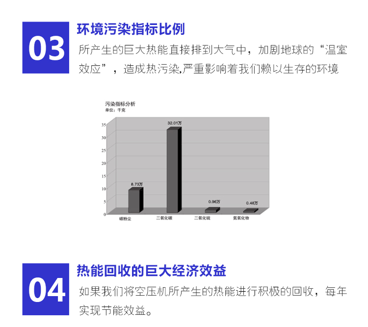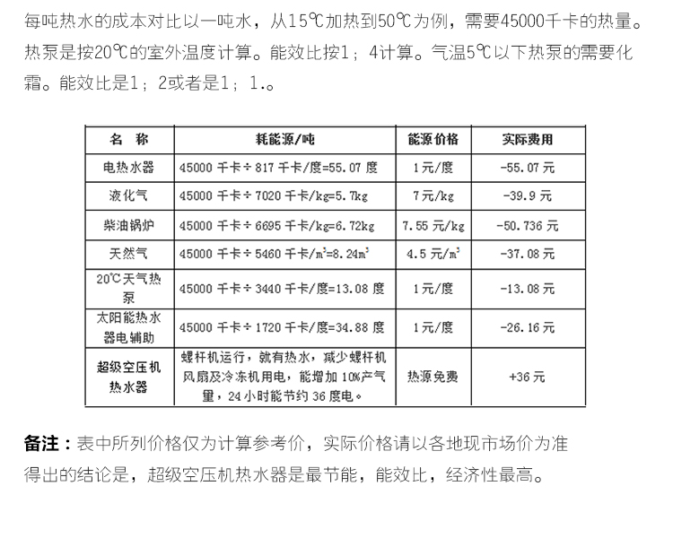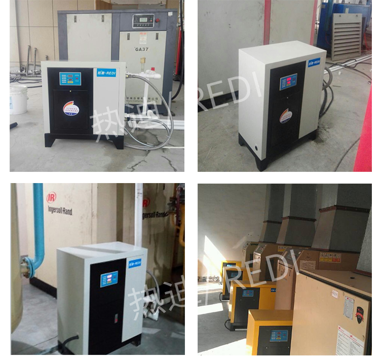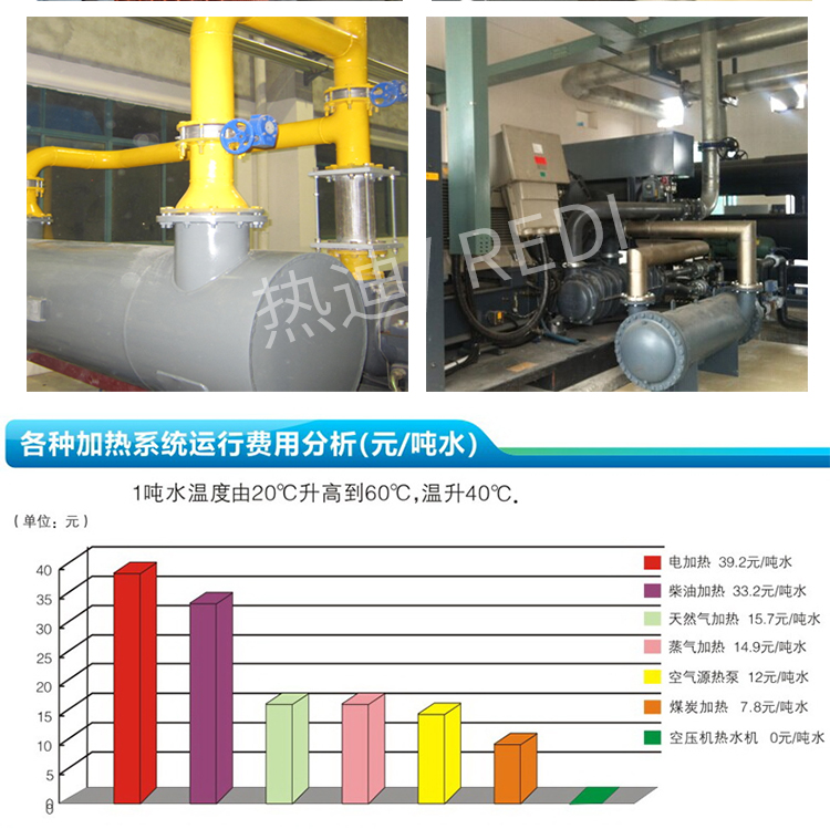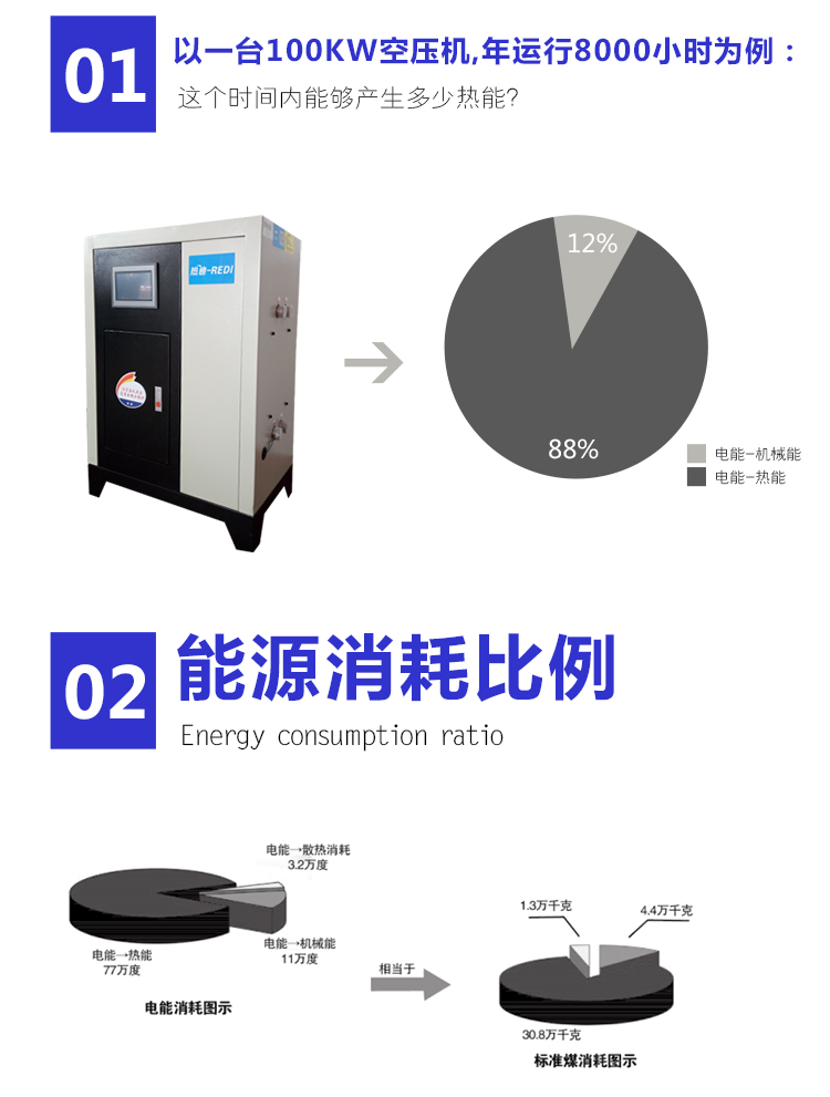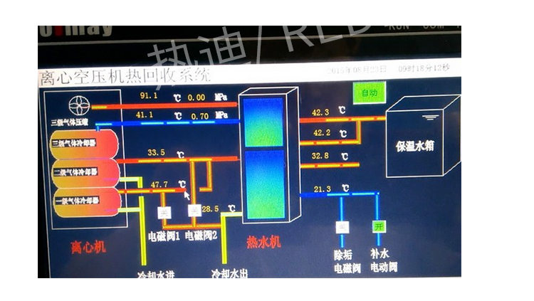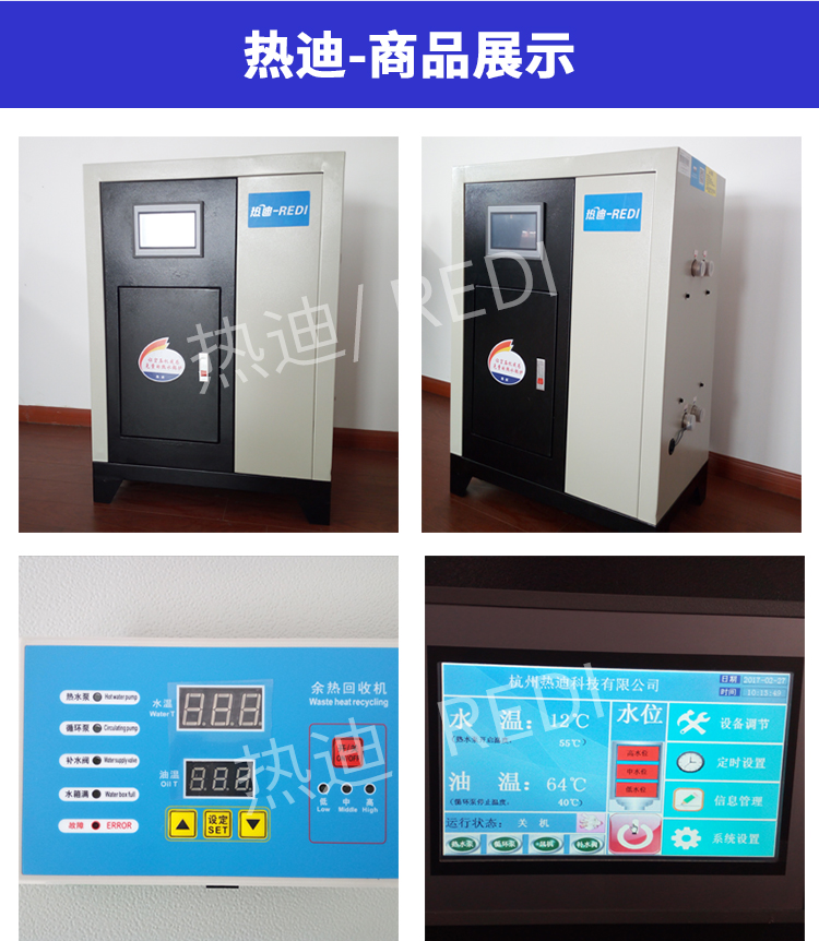 螺桿式空氣壓縮機(簡稱空壓機)的工作流程如下:空氣通過進氣過濾器將大氣中的灰塵或雜質(zhì)濾除后,由進氣控制閥進入壓縮機主機,在壓縮過程中與噴入的冷卻潤滑油混合,經(jīng)壓縮后的混合氣體從壓縮腔排入油氣分離罐,從而分別得到高溫高壓的油、氣。由于機器工作溫度的要求,這些高溫高壓的油、氣必須送入各自的冷卻系統(tǒng),其中壓縮空氣經(jīng)冷卻器冷卻后,最后送入使用系統(tǒng);而高溫高壓的潤滑油經(jīng)冷卻器冷卻后,返回油路進入下一輪循環(huán);根據(jù)計算,在上述過程中,高溫高壓的油、氣所攜帶的熱量大約相當于空氣壓縮機功耗的3/4的轉(zhuǎn)化熱量,余熱溫度通常在80℃—100℃之間。螺桿式空氣壓縮機通過其自身的散熱系統(tǒng)來給高溫高壓的油、氣降溫的過程中,大量的熱能就被無端的浪費了;在提倡建設(shè)節(jié)約型社會的大趨勢下,這種浪費無疑與我們的價值觀念背道而馳,如何回收利用這些余熱,成為本領(lǐng)域技術(shù)人員所急待解決的一個技術(shù)問題。 熱迪為了充分利用螺桿式空壓機所產(chǎn)生的余熱, 我司經(jīng)過多年的技術(shù)積累研發(fā)出一套余熱回收裝置,利用該裝置對螺桿式空氣壓縮機所產(chǎn)生的高溫高壓的潤滑油進行冷卻處理,不僅可以提高空氣壓縮機的產(chǎn)氣效率,而且可使企業(yè)獲得生產(chǎn)和生活所需的熱水,嚴冬可加熱到≥55℃,夏秋季節(jié)≥65℃,從而解決了企業(yè)生產(chǎn)熱水的經(jīng)濟負擔。